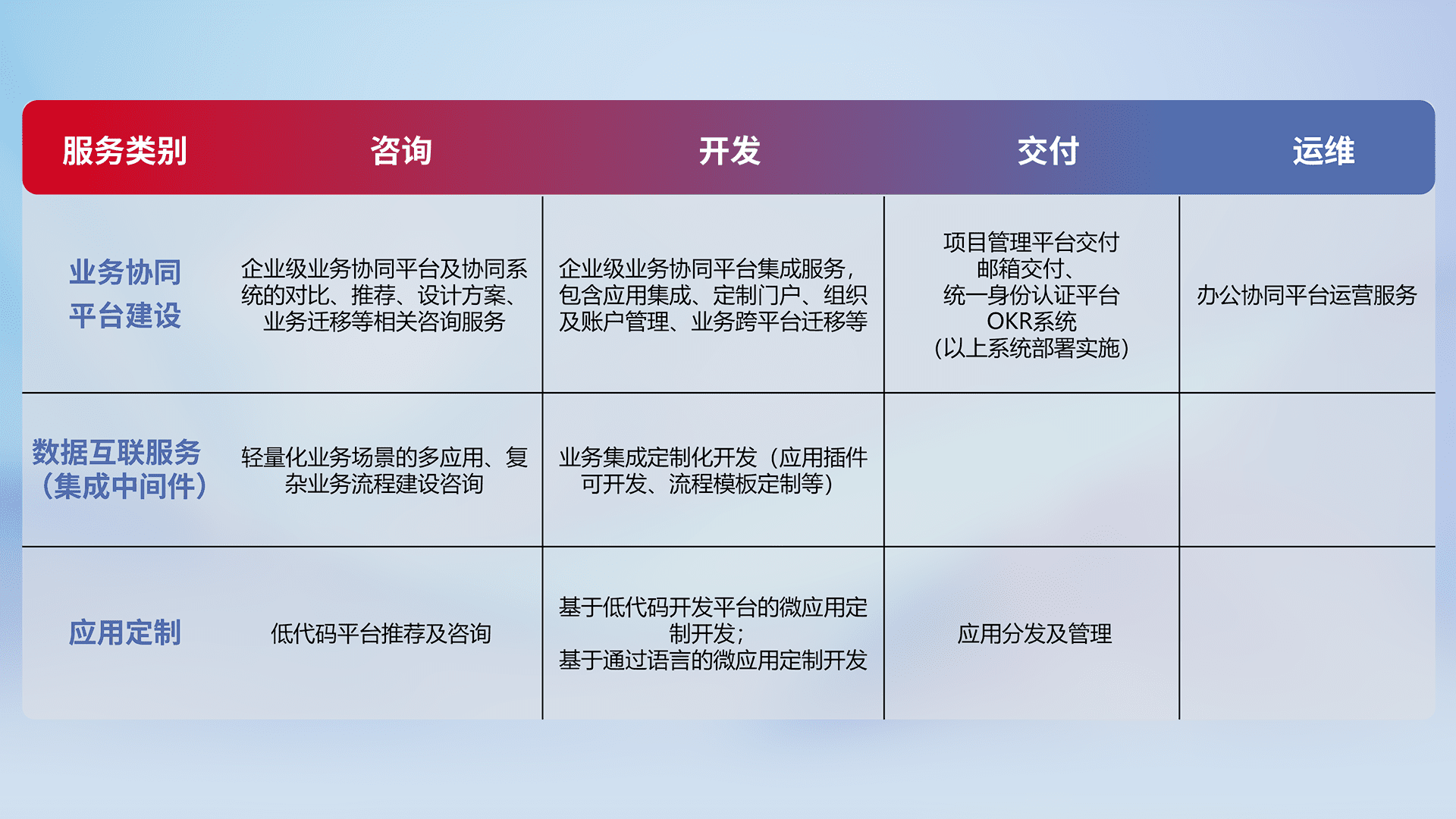 针对钉钉、、、企微、、、IDaas等平台级产品提供产品的规划、、、方案、、、交付、、、、定制化开发等服务,,,,实现如统一协同办公、、、智能客户服务、、混合会议管理、、、智能数据查询、、、、等业务场景,,实现数字化转型。。。。