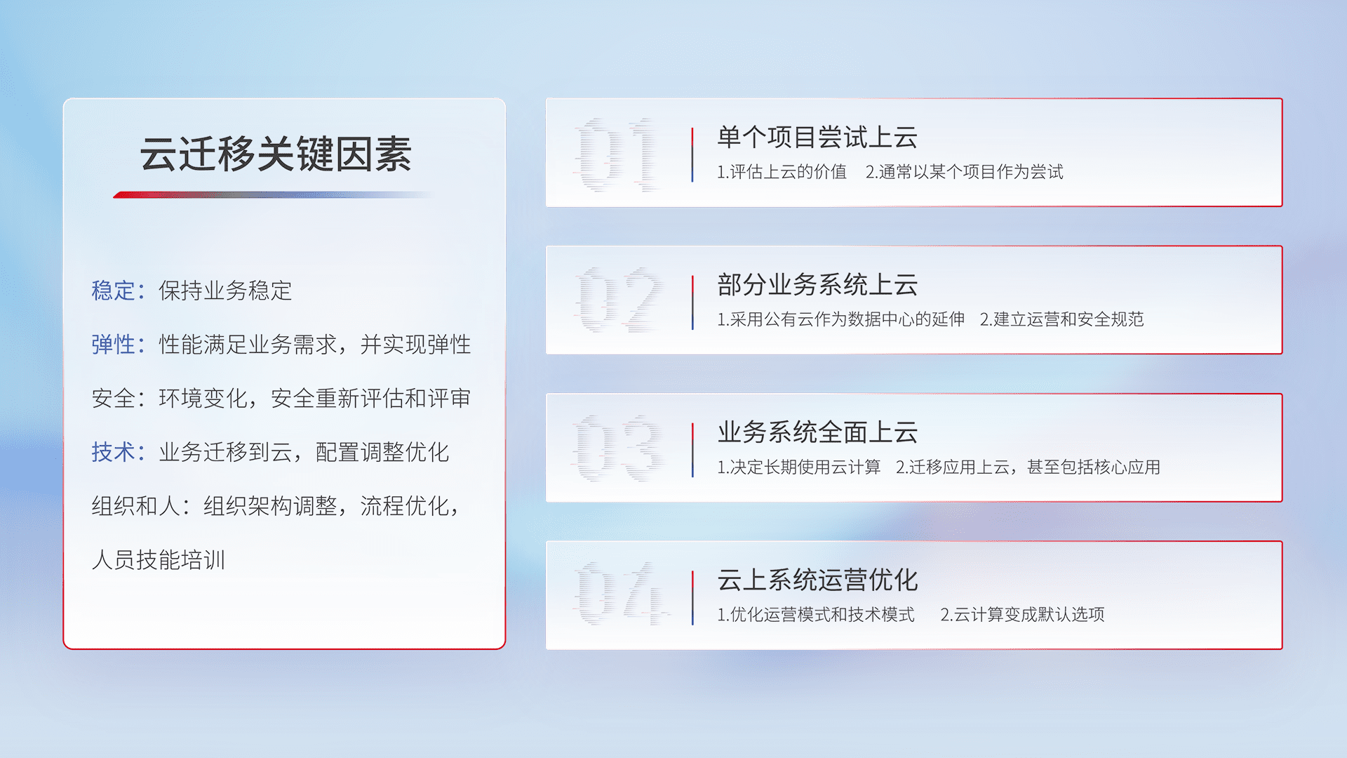 结合实际业务,,,,从规划设计、、、云平台选型、、、、云原生改造、、、、数据迁移、、、集成交付,,迁移全过程为客户识别最佳上云路径,,,做好风险识别管理,,,,设计网络架构、、、身份权限、、、、安全审计合规、、操作审计、、、、日志审计、、监控告警策略、、多站点容灾设计等,,,,对云上基础设施进行整体规划,,,提升IT治理水平,,,以满足弹性、、、、高可用、、、高性能的需求。。。。