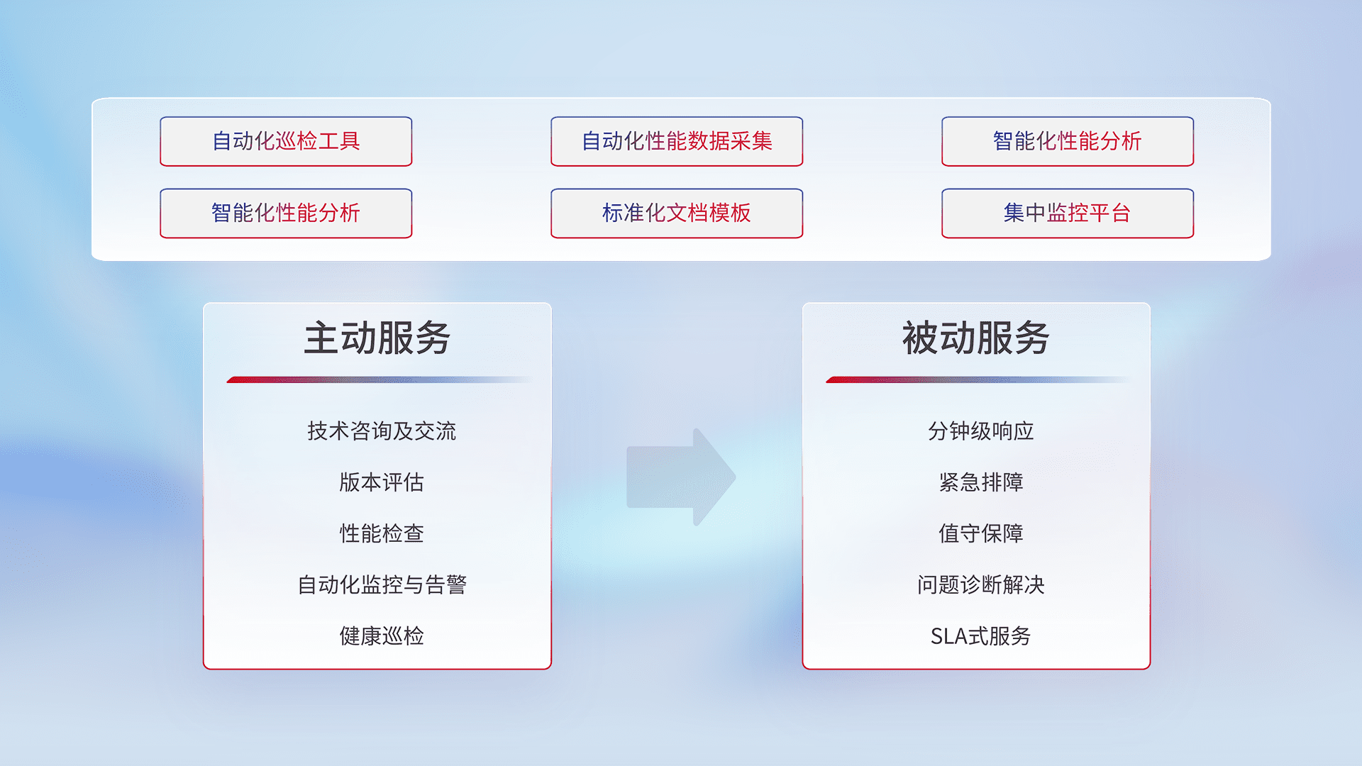 智能化工具和标准化文档,,,,保障服务质量,,提供主动服务(包含技术咨询、、、、版本评估、、、、性能检查、、、自动化监控与告警、、健康巡检)和被动服务包含(分钟级响应、、紧急排障、、值守保障、、问题诊断解决、、、、SLA服务)。。。。